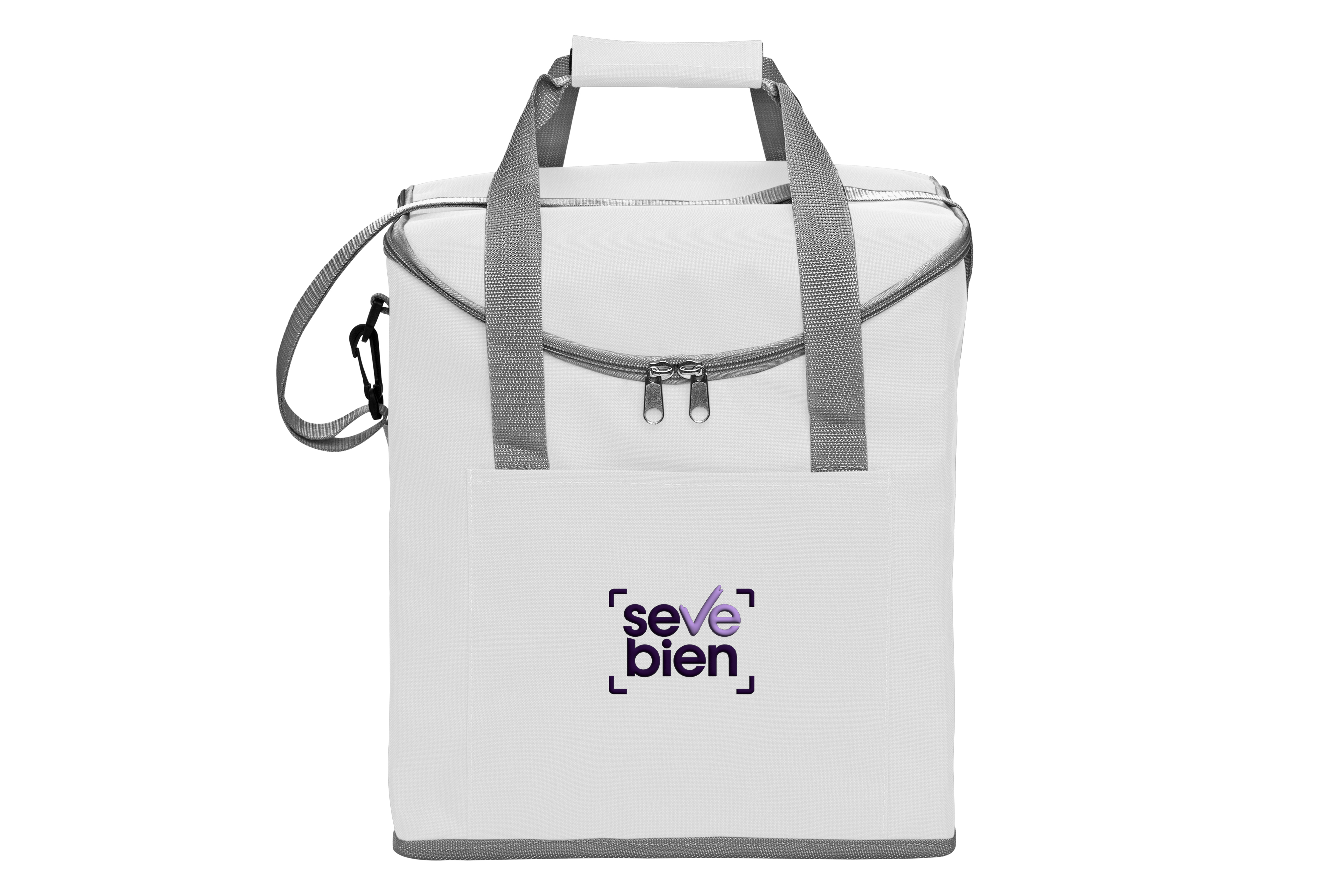 30 x 34 x 19,5 cm. Capacidad 37 litros (Indica el volumen, NO el peso). Poliéster. 600D Lonchera térmica con recubrimiento interior metalizado. Un bolsillo frontal y dos bolsillos laterales de red. Correa tipo bandolera y dos manijas reforzadas con cierre de velcro. Capacidad hasta 6 botellas de 2,5 litros